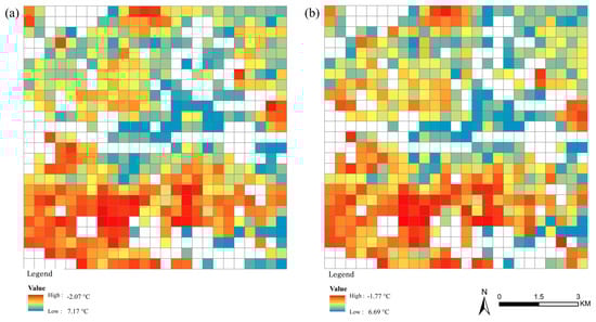 Figure 11. It is clearly shown that the surface urban cool and heat islands are distributed consistently in the two images, and the ranges of the observed and the predicted SUHI values are quite close to each other. This confirms that the two prediction models can predict the SUHI distributions very well.