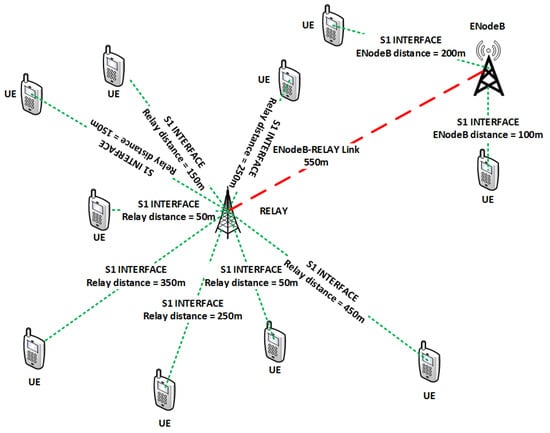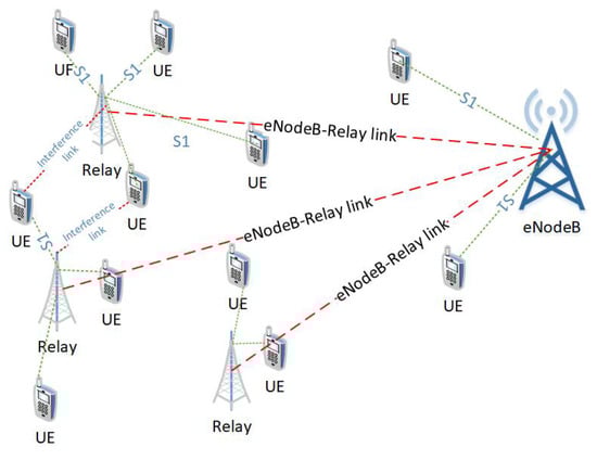 In practical scenarios, multiple relays are deployed to facilitate the cell-edge users as shown in the Figure 7. The multiple relay deployment causes inter-relay interference. This interference can be minimized by the careful deployment of relays, transmit power control, and the scheduling of time/frequency resources. Though, L3 relays incur more processing delay as compared to the L1 and L2 relays but they provide robust transmission in the presence of interference [26]. Assume there are Q relays in a cell, such that relay . The signal-to-interference-and-noise ratio (SINR) at UE k in direct link is given as