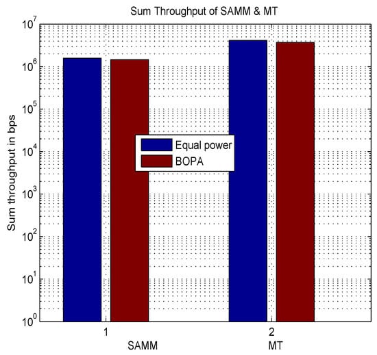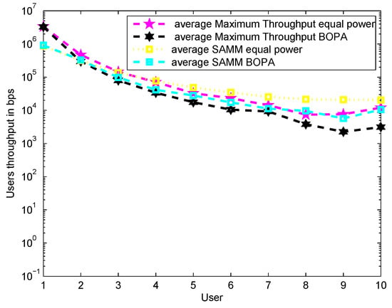 User vs. Throughput averaged over thousand times for SAMM and MT with equal power and BOPA.