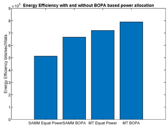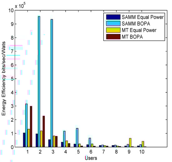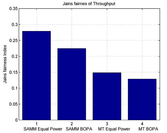 where can be throughput or EE. Figure 5 shows SAMM has better fairness in terms of throughput due to PF in its algorithm. Figure 6 depicts the system’s energy efficiency EE with and without power allocation. The BOPA-based power allocation algorithm allocates the available power to the RB to maximize the energy efficiency EE, therefore, both MT-BOPA and SAMM-BOPA outperforms their corresponding MT and SAMM schemes with equal power allocation.