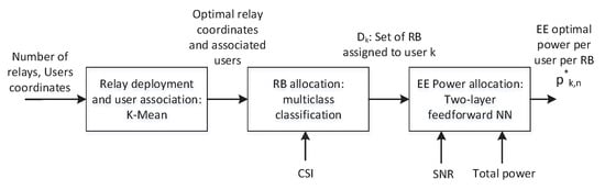 As seen from the above equation, the interference and fairness causes a significant increase in the computational cost when deploying multiple relays. Therefore, we present a machine learning based approach that utilizes relay deployment and users’ association data to develop RB allocation and Power allocation strategy that maximizes the sum EE. Once trained, the proposed approach can save cost of scheduling in every TTI. This is shown in Figure 8, the machine learning model takes the inputs: number of relays, relays’ coordinates, CSI, SNR, and total transmit power and produces the outputs: optimal relays’ coordinates with associated users, set of RBs assigned to each user k, and the optimal power allocation () to each user k in the RB n. Based on single relay performance, the RB allocation block is trained using SAMM and power allocation block is trained using BOPA. Since the relay deployment can significantly alter the RB and power allocation, a clustering approach is presented that determines relay positioning and corresponding users’ association based on a pre-defined metric.