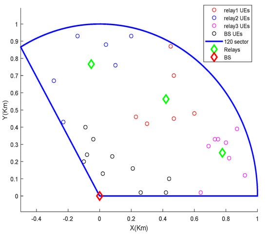 A snapshot of the relay deployment and users’ association algorithm output in a 120 degree sector.