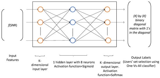 The resource block allocation problem has multiple discrete outputs, i.e., the users, therefore, we use the multiclass classification to classify one out of K users. The multiclass classification is an extension of One-Vs-All classification. The input of the training network comprises of channel state information in terms of the SNR and the output consists of a particular user that maximizes the utility function (throughput for MT and PF metric for the proportional fairness). The training data is obtained from the implementation of SAMM algorithm of [4] as 25,000 K-dimensional samples of received SNR and the corresponding selected users. The dataset is partitioned into three parts, the training dataset, the validation dataset, and the test dataset. These are divided in 70%, 15%, and 15% ratio, respectively. The Matlab Neural Network Pattern Recognition Apps is used to train and deploy the neural network. It uses Scaled Conjugate Gradient algorithm [27] for training. Our application requires neurons in input layer and 10 neurons in output layer. A hit and trial choice of eight neurons in hidden layer gave the best result. The neural network architecture is shown in Figure 10.