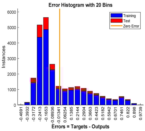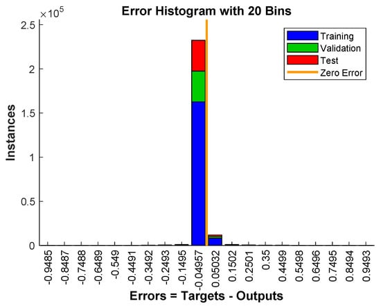 The error histogram of the trained neural network for the training, validation and testing phases.
