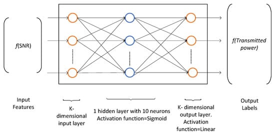 In the power allocation problem, we have to map the numeric input dataset (SNR) to the numeric output dataset (allocated power) per user per RB. Therefore, we use neural network curve fitting technique. The training dataset is generated by the Algorithm 2 as input received SNR and output allocated transmit power. Given the resource blocks allocation set , the power allocation problem has been solved using two-layer feedforward neural network. The hidden layer neurons use sigmoid function as activation function and output neurons implement linear function as shown in Figure 16. We use Bayesian Regularization method to train the neural network. This method typically requires more training time but gives good results for difficult and noisy dataset. The Bayesian Regularization method uses Levenberg-Marquardt optimization to update the weight and bias values. It minimizes a combination of squared errors and weights, and then determines the correct combination for better generalization. In this method, the training does not stops after six consecutive validation (improve) fails and by default max_fail = inf. The training continues until an optimal combination of errors and weights is reached. More detail on the use of Bayesian regularization, along with Levenberg-Marquardt training, can be found in [29].
