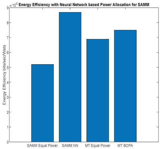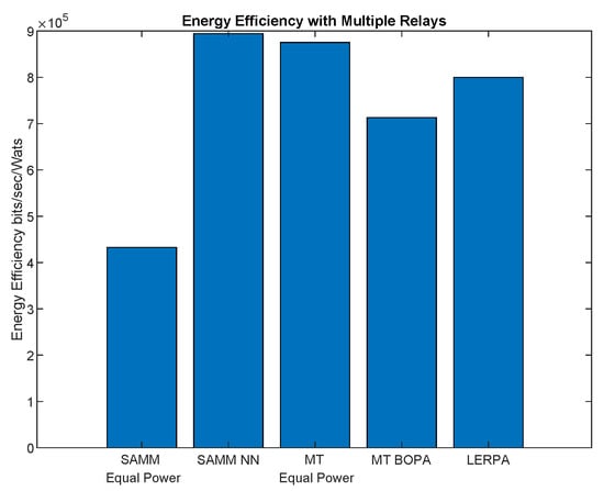 The system energy efficiency with neural network for SAMM which is trained on waterfilling based power allocation among users and BOPA based power allocation among subchannels along with LERPA of [11] in a multiple relays scenario.