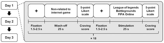 Eighteen short video clips that were not associated with games (referred to as the wash-off trials) and eighteen video clips of addictive games (referred to as the stimulation trials) were alternately presented to the participants using a commercial head-mounted display device (HTC VIVETM VR system; HTC Co., Ltd., Xindian District, New Taipei City, Taiwan). Video clips of three addictive games (League of LegendsTM, BattlegroundsTM, and FIFA OnlineTM), which were three best-selling online games in South Korea at the time of the experiments, were randomly presented to the participants in the stimulation trials; moreover, the number of appearances of each game was set to be identical (six times for each game). Each video clip was 25 s long. Immediately after the presentation of each video clip, a self-reported questionnaire using a 5-point Likert scale for rating the subjective degree of craving for gaming was presented to the participants. The questionnaire consisted of the statement: “Please select a number (1–5) that best describes your current craving for gaming,” and the five scale points were labeled according to the degree of craving for gaming (1 = I do not feel any craving for gaming, 3 = I feel craving for gaming, 5 = I feel a very strong craving for gaming). This experimental procedure was repeated thrice over three different days (hereafter referred to as “Day 1”, “Day 2”, and “Day 3”); further, the video clips used for each experiment were prepared differently. Figure 1 illustrates a schematic diagram of the overall experimental paradigm.