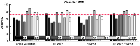 Accuracy in classifying craving states using multimodal biosignals measured during “Day 3” experiments. “Cross-validation” represents the 6-fold cross validation using the “Day 3” data. “Tr: Day 1” implies that the “Day 1” dataset was used as training data. “Tr: Day 2” implies that “Day 2” dataset was used as training data. “Tr: Day 1 + Day 2” implies that both “Day 1” and “Day 2” datasets were simultaneously used as training data. The error bars of median accuracies indicate the first and third quartile of the classification accuracies of all subjects. The red dashed line represents the median classification accuracy for “Tr: Day 1 + Day 2”.
