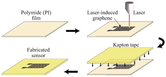 The fabrication process of the laser-induced graphene sensor is shown in Figure 1. A capacitive sensor with two electrodes, each with six interdigitated fingers, was designed to demonstrate the concept. Commercial polyimide film (Zibo Zhongnan Plastics Co., Ltd.), with a thickness of 0.025 mm was used as the processing material to form the laser-induced graphene. An OLS 6.75 CO laser system with a laser spot diameter of 150 m was used to perform the laser-induction process upon the film attached on a glass substrate with a tape. The laser-irradiation of the polyimide film caused the photo-thermal generation of the graphene as a result of local heating of the film. The carbon atoms being bonded with oxygen (C–O, C=O) and nitrogen (C–N) atoms via sp and sp hybridization were broken down and rearranged to form several layers of sp hybridized carbon atoms of graphene [27]. The irradiation process was obtained by optimizing the laser parameters, including power, speed, and z-axis of the laser system. Power refers to the magnitude of the energy on which the laser nozzle operates. Speed (m/min) refers to the rate of movement of the laser nozzle over the sample in x-y directions. z-axis (mm) defines the focal point of the laser on the sample. The optimized values of these parameters were: 7 W of power, 70 m/min of speed, and 1 mm of z-axis.