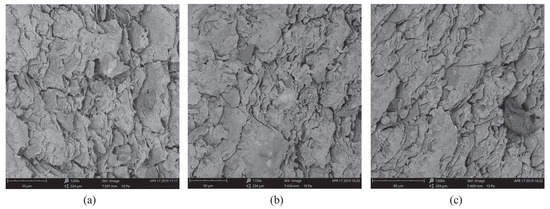 The SEM images of the top view of the transferred graphene on Kapton tape are shown in Figure 2. The images were taken with a PHENOM XL Benchtop SEM. It can be seen from these images the clarity of the transferred graphene over the Kapton tape. The graphene particles as seen from the 1250× magnified view are distributed quite uniformly, well connected, which negates any deterioration in the electrical conductivity of the electrodes. The graphene flakes show an ultra-polycrystalline feature, indicating the existence of an abundance of grain boundaries composed of pentagon and heptagon pairs, which account for the porous structure of graphene [27]. Such structure offers a higher surface area and good sensitivity for sensing purposes [29]. The sticky nature of the Kapton tape kept the graphene powder intact, even after performing experiments with the sensor. To validate this, we once again observed under SEM, the graphene morphology of the sensor after complete cycles of repetitive electrochemical and mechanical sensing tests elaborated in Section 4. The comparison between the graphene morphology of the sensor before and after the tests is given in Figure 3. As can be seen, there is no significant morphological difference between them. It is later shown that the sensing performance was also relatively stable throughout the repetitive tests. This demonstrates that the proposed fabrication approach, i.e., the use of sticky Kapton tape and the manual pressure during the transfer of graphene, results in a firm attachment of the graphene powder, to survive the liquid immersion and physical deformation.