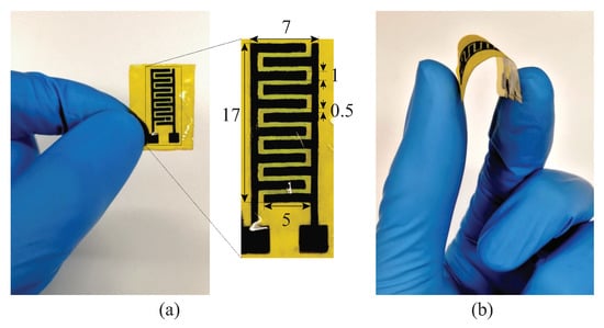 (a) Fabricated sensor with detailed design (all dimensions are in millimeters). (b) The bending view showing the flexibility of the sensor.