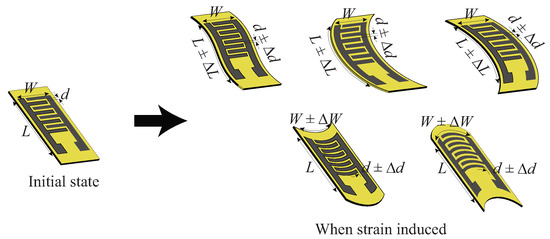 Another sensing mechanism of the sensor heavily relies on the dependency between the sensor geometry (length (L), width (W), and gap between interdigitated fingers (d)) and its electrical properties. Due to its flexible nature, any strain induced on the sensor leads to the change in its overall dimensions (, , ) as compared to its initial state. This is illustrated in Figure 6 showing a wide range of deformations possibly happen to the sensor. For instance, when the sensor is uniaxially bent, it is elongated in the length or width direction of the sensor which consequently changes the gap between the fingers in either direction, and hence the overall capacitance of the sensor. Such deformations concurrently affect the distribution of the graphene over the substrate, which contributes to the change in the resistance of the sensor. Consequently, the total impedance (Z) of the sensor changes, through which, therefore, strain can be sensed and quantified. In this work, we reported the sensor response in terms of magnitude of the complex total impedance ().