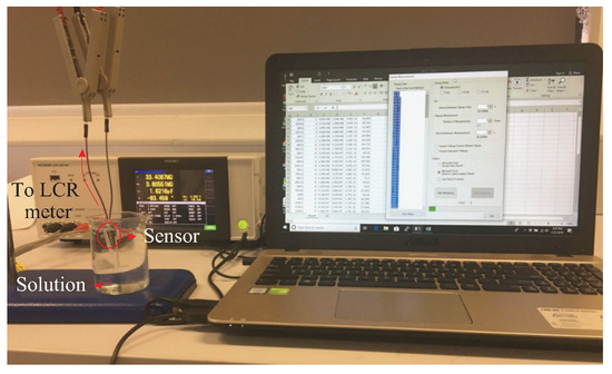 Figure 7 shows the experimental setup used for the measurement of the sulfate concentrations. Two wires were connected to the bonding pads of the electrodes with conductive silver epoxy. The sensor was carefully dipped inside the sample up to the level of the bonding pads and its impedance response was measured. To restrict the movements of the sensor during the experiment, it was attached onto an acrylic board with tape before dipping it into the sample. Five different samples with concentration levels ranging between 1 ppm and 10,000 ppm were used. An input voltage of 1 V RMS with frequency swept from 10 Hz to 4000 Hz was applied to the sensor. The immersion of the sensor during data collection was normally in a matter of seconds. To validate the consistency of the sensor responses towards the measured concentrations, the experiment was repeated three times for each concentration. A gap of 5 min was given between each cycle, where the sensor was washed and dried before the next experiment.