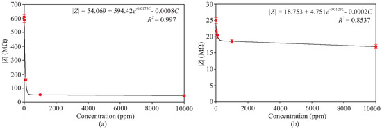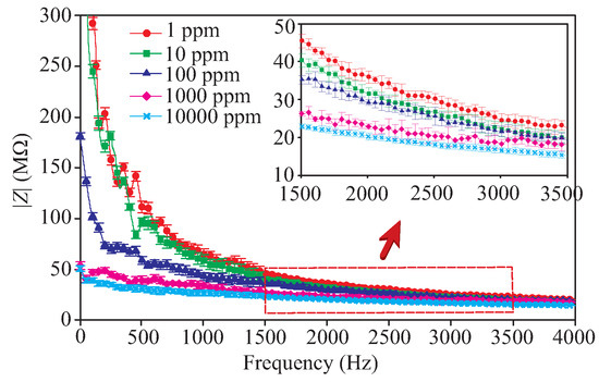 Figure 8 shows the relation between the sensor impedance with the sulfate concentration over the observed frequency range. averaged over the three sets of measured results obtained for each concentration. Once the conductive electrodes are immersed into the sulfate solution, and a voltage is applied, two layers of polarized ions are generated at the interfaces of the electrodes. One layer is formed within the conductive electrodes whereas the other layer with an opposite polarity is distributed in the solution. The latter is composed of solvated ions that are attracted towards the polarized electrodes. Both layers are typically separated by a single layer of hydrated molecules acting like a dielectric in a conventional capacitor. The physical and chemical interactions between the ions in the electrodes and those in the solution cause a nonlinear charge distribution, which results in a double layer capacitance phenomenon [47]. Together with the direct capacitive coupling between the interdigitated electrodes [47], this phenomenon leads to the impedance behavior shown in Figure 8. The sensor impedance is high when the concentration of the sulfate is low and decreases as the concentration level increases. This is due to the decrease in the solution resistance and the increase of the double layer capacitance along with the rise of the ion concentration in the solution [47]. It can also be seen that the sensor seems to be more sensitive in the low concentration range as a result of the unsaturated distribution of the solvated ions (i.e., Na cations/SO anions) at the electrodes’ interfaces [11],and hence their electrostatic interaction with the polarized ions within the electrodes.