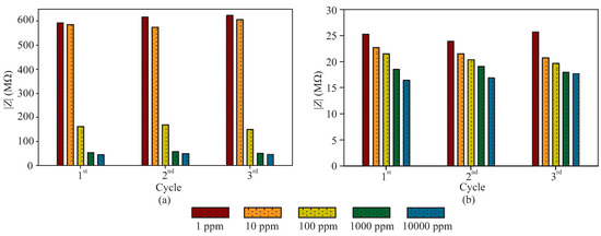 To further highlight the consistency of the sensor responses implied in Figure 8 and Figure 9, we also depict in Figure 10a,b the responses of the sensor for each measurement cycle at the selected frequencies of 28 and 3500 Hz. As can be seen, the responses of the sensor for each cycle were very close to each other. The decreasing trend in the change of the impedance is also maintained for each cycle. The calculated relative standard deviations of the repetitive tests for five different concentrations (i.e., from 1 to 10,000 ppm) are 2.72%, 2.78%, 5.99%, 6.55%, and 3.76% at 28 Hz and 3.72%, 4.63%, 4.39%, 3.15%, and 3.67% at 3500 Hz, validating the similarity of the results of the three cycles. With the sensor’s flexibility, quick response time, sensitivity, and biocompatibility, it can therefore be implied that such sensor would be a great candidate to be applied in wearable environment for electrochemical sensing of different analytes on the human body.