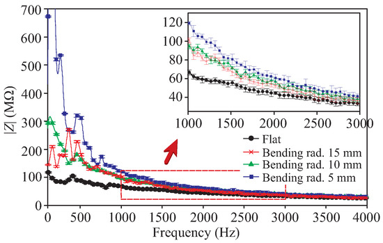 Prior to applying the sensor for sensing of human body-induced strains, we measured the sensor impedance as a function of frequency. In this case, we situated the sensor in four different conditions, i.e., flat and bent over three different curvatures. The aim was to briefly investigate the response of the sensor towards the change in its physical dimensions. The response is depicted in Figure 11 averaged over the results of four measurements taken per condition. As can be seen, the changes in the impedance were obvious, suggesting a potential for strain sensing. In comparison to the result when the sensor is flat, the impedance of the sensor increases when the bending radius decreases. This is predominantly due to the increase in the gap between the interdigitated fingers, leading to the decrease of capacitance. A decreasing trend over frequency can be seen in the impedance values as well as the sensitivity of the impedance. Even though the sensor seems to be more sensitive in the low-frequency region (<1000 Hz), the change in the impedance is as not as stable as that of the upper frequency. For this reason, it was decided to apply 1000 Hz AC signal for the rest of the measurements in this section.