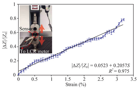 Change in sensor impedance with respect to different strain values applied in the direction illustrated in the inset. The impedance change () is shown relative to the impedance when no strain induced ().