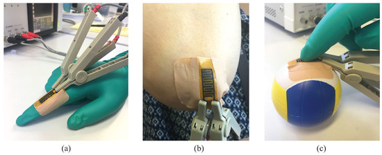 The setup for the human body-induced strains sensing are given in Figure 13. The first scenario was to apply the sensor to sense the repetitive movements of two selected body joints, i.e., finger and elbow joints (Figure 13a,b), while the second scenario was to apply the sensor to sense the repetitive touching of a gloved index finger (Figure 13c). In the first scenario, the sensor was attached directly on the corresponding joints of a 36-year-old female volunteer with adhesive tape, and the impedance response of the sensor was measured while the volunteer was performing repetitive movements of her finger and elbow. The sensor was positioned on the body in such a way that the applied strain mainly influenced the main sensing area of the sensor. In the second scenario, the sensor was attached over a soft surface of a 3 cm-radius ball with tape, and the impedance response was measured while the repetitive touches were applied by the volunteer. In all testing scenarios in this section, an AC signal of 1 V RMS with 1000 Hz frequency was applied to the electrodes. During the experiments, the volunteer was instructed to keep the movements as consistent as possible. Particularly for the second scenario, the touches were maintained to be on the same spot of the sensor without any significant pressure.