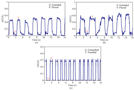 The response of the sensor for the tactile sensing is shown in Figure 14c, where the terms ‘Untouched (U)’ and ‘Touched (T)’ pertain to the non-contact and contact states of the volunteer’s index finger and the sensor. The change in the sensor impedance (||) is shown relative to the initial impedance of the sensor (||), i.e., ‘Untouched (U)’ state. A stable impedance variation corresponding to the changes between two states is shown. It was observed during the experiment that the sensor impedance changed promptly without any delay once touched gently by the gloved finger. This suggests that the change was predominantly induced by the permittivity change of the surrounding material (i.e., the presence of the finger on the surface of the sensor), rather than the pressure-induced mechanical deformation and recovery of the sensor. In some cases, the latter mechanism results in more response delay due to the intrinsic slow resilience processes of typical synthetic polymer [5,7]. When the gloved finger, which is a grounded conducting medium, touched the sensor, the electromagnetic couplings between interdigitated electrodes were affected. This led to the decrease in the sensor capacitance and hence the increase in the sensor impedance [7,11]. The effectiveness of the tactile sensing of this capacitive sensor is also attributed to the prominent fringing fields of a coplanar type capacitive sensor as explained before.
