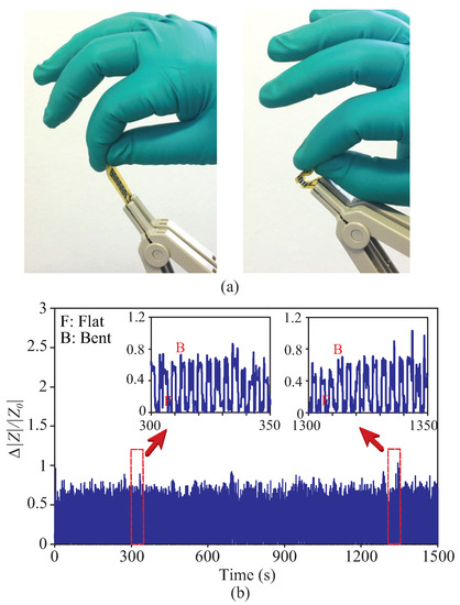 Understanding the importance of the sensor durability in strain-sensing applications, we have also conducted a long-term mechanical test. The repetitive bending-releasing cycle with approximately 10 mm bending radius was applied manually by hand to the sensor as illustrated in Figure 15a. The duration of each test was 25 min long and the process was repeated three times giving a total of approximately 1300 bending-releasing cycles. The division of the experiment into three separate phases was due to the manual setup of the test, where it was very challenging to maintain the consistency of the applied strain or bending curvature for a long period of time. The sensor performance from one of the testing cycles is given in Figure 15b, showing a stable long-term response towards the change in its physical structure. As before, the change in the sensor impedance (||) is shown relative to the impedance when the sensor is in flat position (||). The similar response was observed in two other testing phases with a variation in the change of impedance not exceeding 10%. This variation can be understood mainly due to the unavoidable deviation in the bending curvature applied manually by the volunteer’s hand. The accuracy and resolution of the proposed sensors were found to be approximately 2.3% and 3.8% of the full scale, respectively.