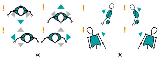 The system is capable of detecting incorrect positions and body postures, and of indicating in which direction the patient must move to meet the acquisition requirements. These instructions are conveyed through visual elements located in a panel placed either to the right or to the left of the main scene, depending on the arm that requires rehabilitation. Figure 2 illustrates examples of different visual instructions to correct the patient′s position (Figure 2a, zenithal view) and the body posture Figure 2b. Only when all the requirements are met, the system allows to start the exercise. A full view of the acquisition interface, including these controls, can be found in Figure 3.