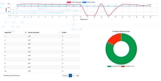 Figure 5 shows a report of a series of 20 repetitions of a concentric exercise, which consists of a line chart displaying the performance (degrees achieved) by individual repetitions (pink curve), together with the established goal (blue line), a table comprising the exact figures of repetition results, and a doughnut chart summarizing the percentages of correct repetitions in green (the goal is achieved) and of incorrect repetitions in red (the goal is not achieved).