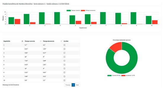 In the case of reports of individual series of isometric exercises, Figure 6 illustrates an example of a series of 10 repetitions composed of a column chart showing, for each repetition, the correct and the incorrect execution times in the green and red columns, respectively, a table comprising the exact figures, and a doughnut chart summarizing the percentages of accumulated times of correct and incorrect execution.
