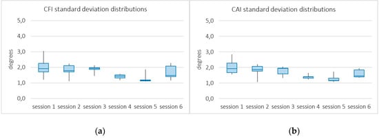 Box plots from distributions of the standard deviations of the Concentric Abduction Index (a) and the Concentric Flexion Index (b) across patients over the six sessions.