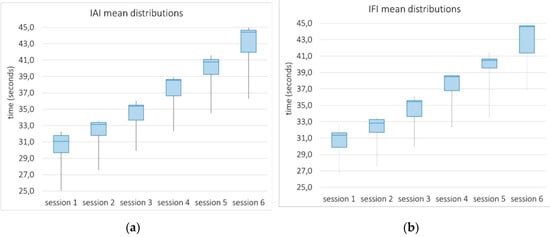 Box plots from distributions of the mean values of the Isometric Abduction Index (a) and the Isometric Flexion Index (b) across patients over the six sessions. These measures ranges from 0 to 45 s, with the latter being the goal established in this study.