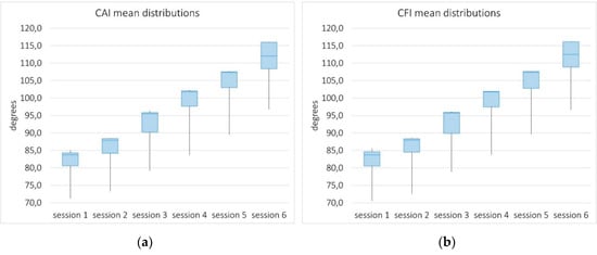 Box plots from distributions of the mean values of the Concentric Abduction Index (a) and the Concentric Flexion Index (b) across patients over the six sessions. These measures ranges from 0 to 120°, with the latter being the goal established in this study.