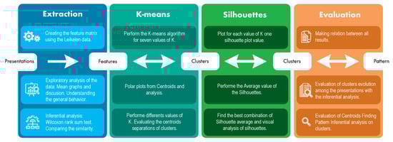 K-means [43] is an iterative data partitioning algorithm that assigns i observations to exactly one of the k clusters defined by centroids. The value of k is defined before the algorithm starts, and clustering is achieved by minimizing the sum of the distances of the squares between the data and the centroids of the clusters. In this work, the algorithm K-means was used to partition student data into k clusters.