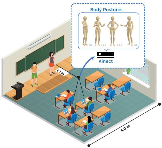 In the more specific context of postural patterns, many previous works have used traditional cameras to collect data [27,28,29,30,31]. Using a Kinect device, a study [32] proposed an alternative to solve problems that would otherwise be difficult to address using conventional cameras in the recognition of human postures. They used the skeletal tracking tool provided by the Kinect SDK to collect joint information. Based on the tracked skeleton, joint positions and angles were used as features. These were then used in the support vector machine (SVM) technique to recognize human postures. Munoz et al. [5] developed a tool to capture, classify (using AdaBoost algorithm) and visualize the body postures of students, using a Kinect device, also allowing the use of data from other sensors.