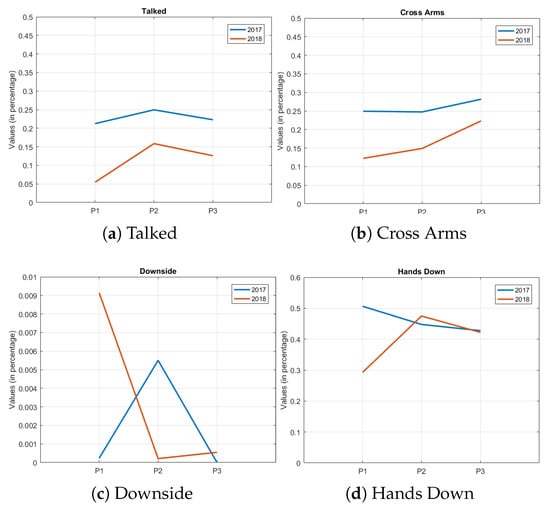 The first group of attributes (similar values of evolution throughout the presentations) have a very clear similarity and can be observed in the chart of talked and Cross Arms, for example, Figure 4a,b. In this group, the behavior is the same in the three presentations of the semester; if one value of the variable falls in one year in the second presentation, it also falls in the same presentation of the other year. It should be noted that this decrease or increase in attribute value varies between years and in intensity.
