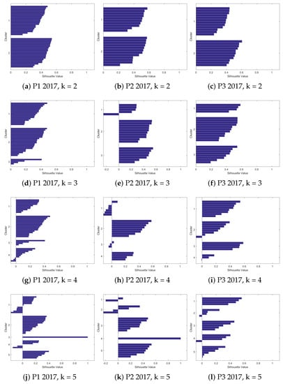 Observing again Figure 5 and Figure 6, the initial values of k have few observations with negative Silhouettes values (indicating that the observation does not belong to the cluster). This suggests that the best number of clusters is in the first values of k. For the first year of evaluation (2017), one can also note that the best groupings are in the first two values of k. After k = 3, the algorithm starts assigning groups with only one observation. There are also many negative Silhouettes values.