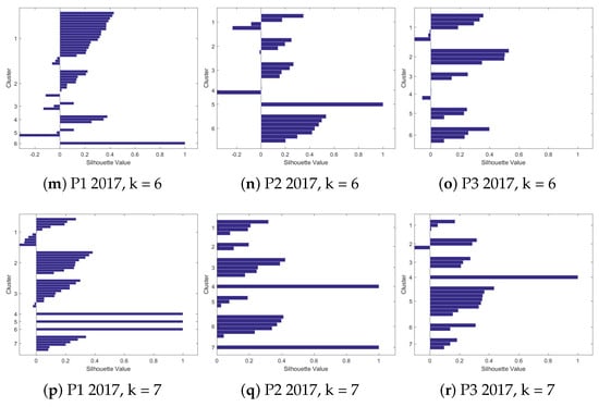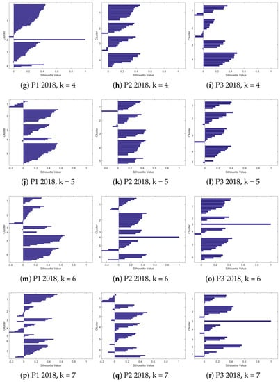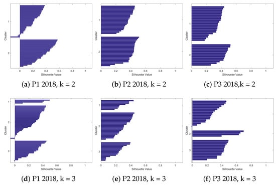 For the year 2018, there was a greater variation in the values of k. The value of k = 3 was chosen again. This value (k = 3) presents a good clustering, as can be seen in Figure 6d–f. The average value of the silhouettes does not present such high values, but to compare with presentations for the year 2017, it is important to choose the same value of k for the two years.
