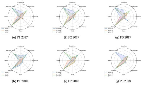 What can be seen in both years (2017 and 2018) is that there is a convergence of some attributes with greater values, in the last presentation. For example, it can be seen that Group A, in two years, has a similar value for the CrossArms variable. In the same way, Group B has attributes with similar values, such as Watching public and CrossArms. Group C presents some variation between the presentations, but it is possible to perceive a similarity between the presentations of the two years.