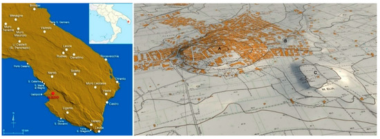 Localisation of Alezio on DTM of Salento and altimetric model of Alezio: A, hill of Lizza; B, Raggi area; C, Monte D’Elia area.