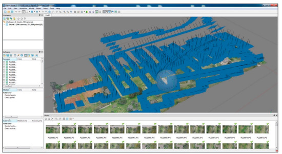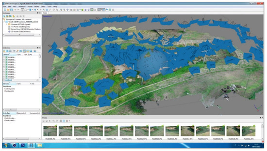 The entire archaeological park was covered with a sufficient image overlap (about 70–80%), essential in order to get the tracking points in space and their resulting 3D position. The processing of the images by Agisoft Photoscan software (v. 1.4.0.5076, Agisoft, St. Petersburg, Russia) led to the alignment of the photos with a minimum margin of error (0.6/2.0 pixel) and to the creation of a dense cloud of about 19 million points. The model obtained was georeferenced through four ground control points (GCPs) located on the corners of the park and collected with a total station, to guarantee its correct scaling and orientation [11,12,13,14].