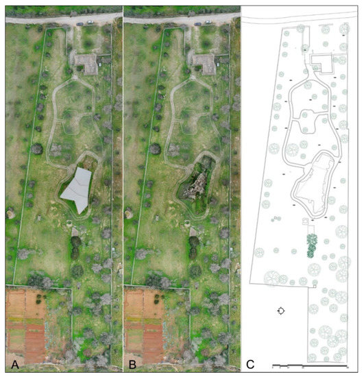 The 3D survey: (A), the digital aerial photogrammetry of the archaeological site; (B), the aerial survey merged with the digital close range photogrammetry of the tombs current visible under the metal cover; (C), CAD plan.