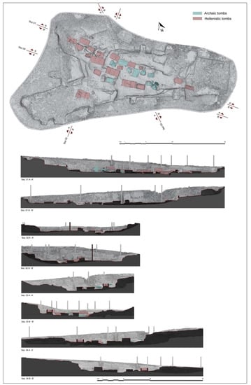 After analysing the morphological characteristics of the site and the presence of several sarcophagi and chests tombs, we have set up scanning stations at an average distance of about 5 to 7 m, between each other, in order to have a good coverage of all surfaces. The survey was performed with a P20 laser scanner (Leica, Milano, Italy) using an accuracy of 6 mm on a dome of 10 m radius [15,16,17,18]. The matching of point clouds was done manually. From them, a three-dimensional model was obtained with a mesh of about 7 million polygons with a resolution of 10 mm. Plan and sections of the area have been processed (Figure 5) starting from the scaled model.