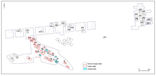 The new relief of the still visible tombs has highlighted that the nos. 10, 26, 28, 29, 30 and 34, documented in the Duma-Zingariello plan and in some photos collected in 1981 [3] (Figure 3) and [5] (Figure 6), were unfortunately destroyed during the excavation of 2004, while the remains of the nos. 12 and 24 have been slightly displaced with respect to the original position. The location of tomb no. 8, today not preserved and absent in the Duma-Zingariello plan, is uncertain.