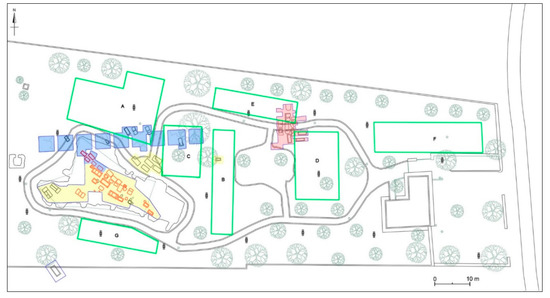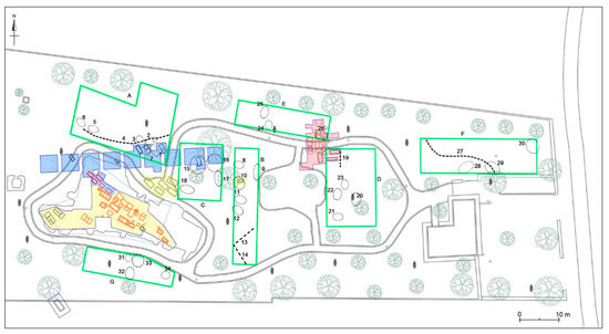 A wide range of geophysical methods are applied in archaeology for obtaining high-resolution images of the subsurface. The geophysical method used in this study is based on the detection of variations in the electromagnetic properties of the subsoil and the use of these data to identify artefacts and distinguish between these and natural variations in the soil. Seven areas, labelled respectively A, B, C, D, E, F, and G were considered for GPR survey (Figure 7). It was necessary to choose seven different areas due to the current conditions of the archaeological park: in fact, the presence of numerous obstacles, such as walls, roads, trees, and light poles, did not allow us to cover the overall surface of the site.