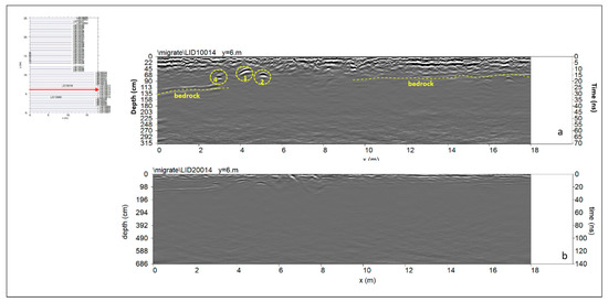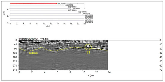 Area G was about 23 × 6 m. In this area an electromagnetic energy penetration depth of 40–45 ns was found. Figure 15 shows the processed radargram related to the 1st profile and to the 600 MHz antenna. It shows several hyperbolic shaped reflection events. The first reflection event (dashed yellow) continuous and slightly undulating reflector appears strong and irregular and reaches a maximum depth below the ground surface ranging from 0.8 to 1.30 m. This event could be related to the shallow bedrock visible also in the old excavations (Figure 6). The reflection events labelled 31 is visible at depth from about 0.40 m to 0.60 m. The dimension (about 0.80 m) and shape suggest that it is probably related to the presence of a tomb. Particularly it is important to underline that this event show a polarity inversion of the electromagnetic wave and this is related to the presence of void [38].