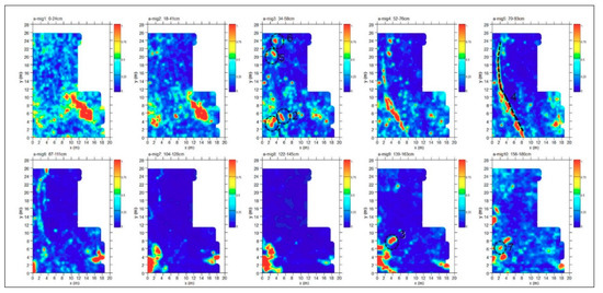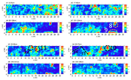 In order to identify the depth evolution of buried structures, including their size, shape and location, time slices using the overlay analysis [41,45] were built (Figure 9). The time slices show the normalized amplitude using a range defined by blue as zero and red as 1. In the slices ranging from 0.34 m to 0.58 m depth, relatively high-amplitude alignments (labelled 1, 2, 5 and 6 respectively) are clearly visible. These correspond to the anomalies labelled 1 and 2 in the radargram (Figure 8). In the time slices (Figure 9) ranging from 0.70 m to 0.90 m depth the dashed dark line highlights a high-amplitude anomaly (labelled 4); in the same area, the latest two time slices ranging from 1.39m to 1.8m depth show other high amplitude events (labelled 3 and 7).