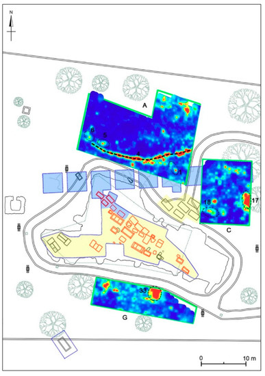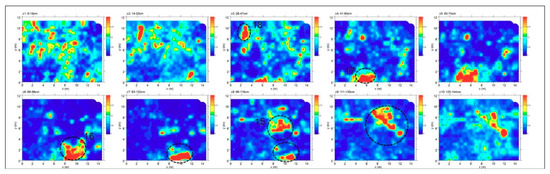 Area C was about 15 × 13 m. The time slice analysis (Figure 11) show several high electromagnetic energy amplitude events labelled 15, 16, 17 and 18, respectively. The shape, the dimensions and the alignment with the other excavated tombs allow one to interpret these as probable tombs.