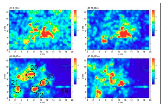 Area D was about 13 × 20 m. The time slice analysis (Figure 12) show several high electromagnetic energy amplitude events labelled 20, 21, 22 and 23, respectively. The shape, the dimensions and the alignment with the other excavated tombs allow one to interpret these as probable tombs.
