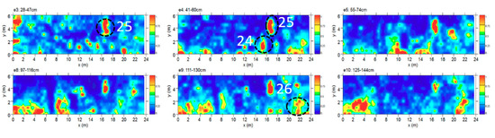 Time slices of Area E: the most significant anomalies, probably related to tombs, are highlighted at depth of 68–87 cm (24, 25) and 111–130 cm (26).