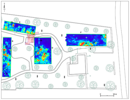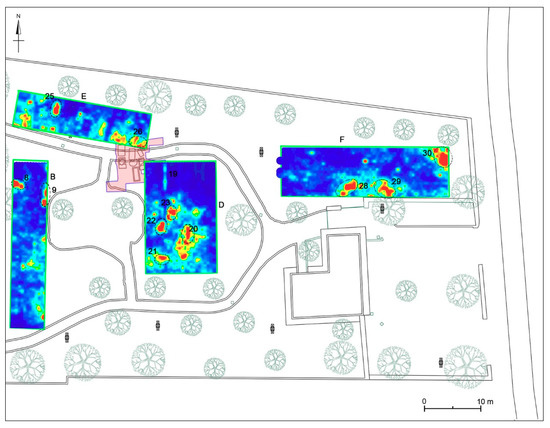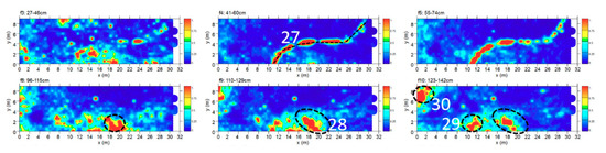 Area F was about 31.5 × 9 m. The time slice analysis (Figure 14) show several high electromagnetic energy amplitude events labelled 27, 28, 29 and 30, respectively. The shape, the dimensions and the alignment with the other excavated tombs allows these to be interpreted as probable tombs. The anomaly labelled 27 was attributed to a modern pipeline.