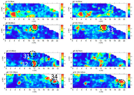 Time slices of Area G: the most significant anomalies, probably related to tombs, are highlighted at depth of 41–60 cm (31, 32), 69–102 (33) and 110–143 (34).