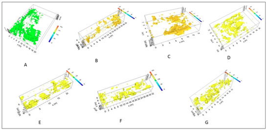 Areas A-G: the collected data displayed set with iso-amplitude surfaces, using a certain percentage of the maximum complex trace amplitude threshold value.